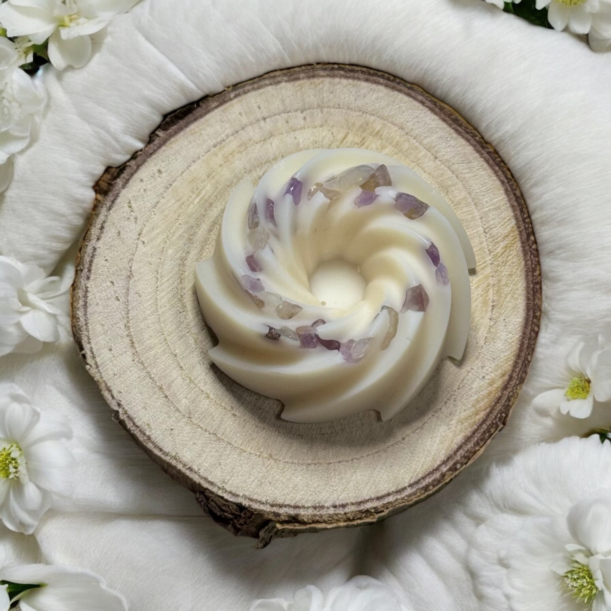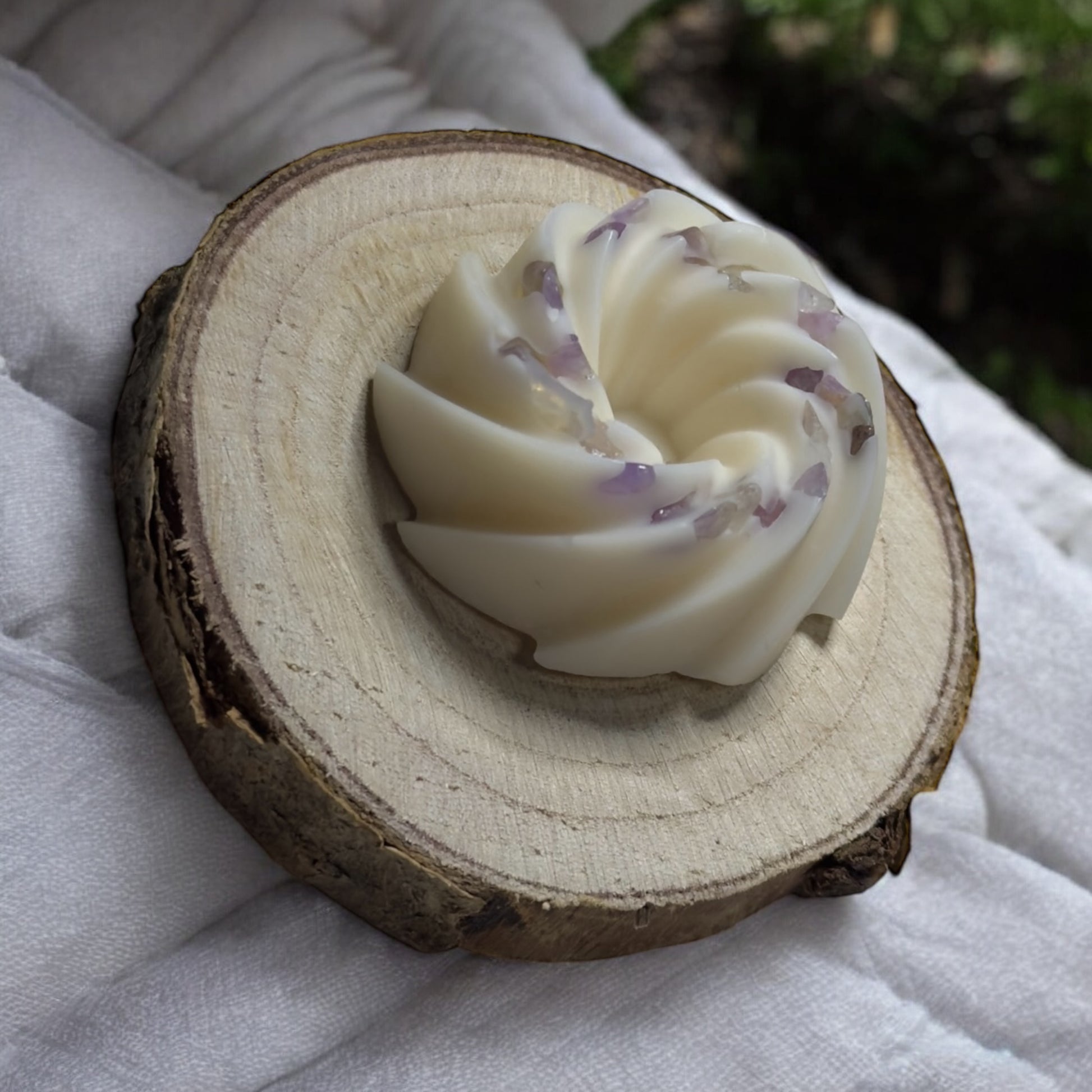 Fondant parfumé de 17 grammes avec éclats d'améthyste sur le haut du fondant.